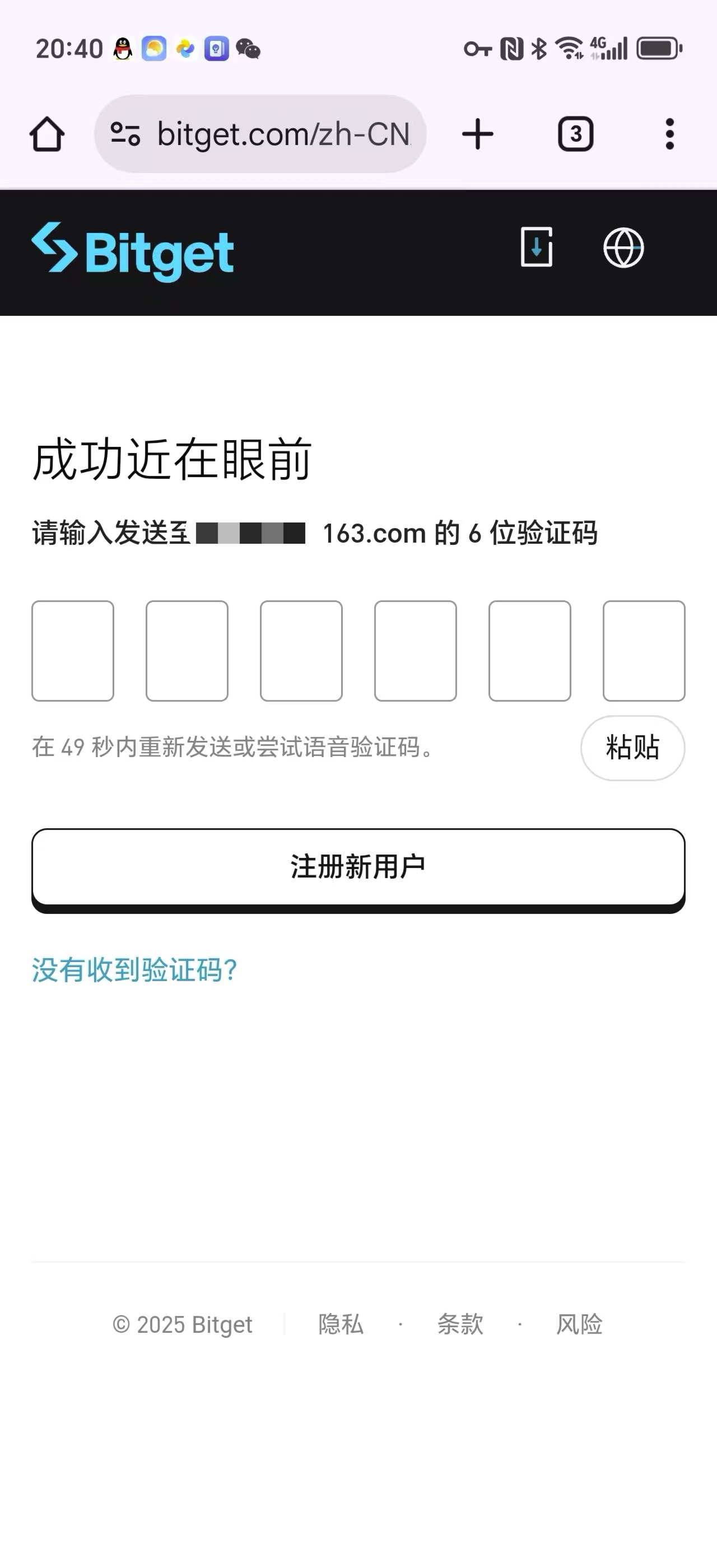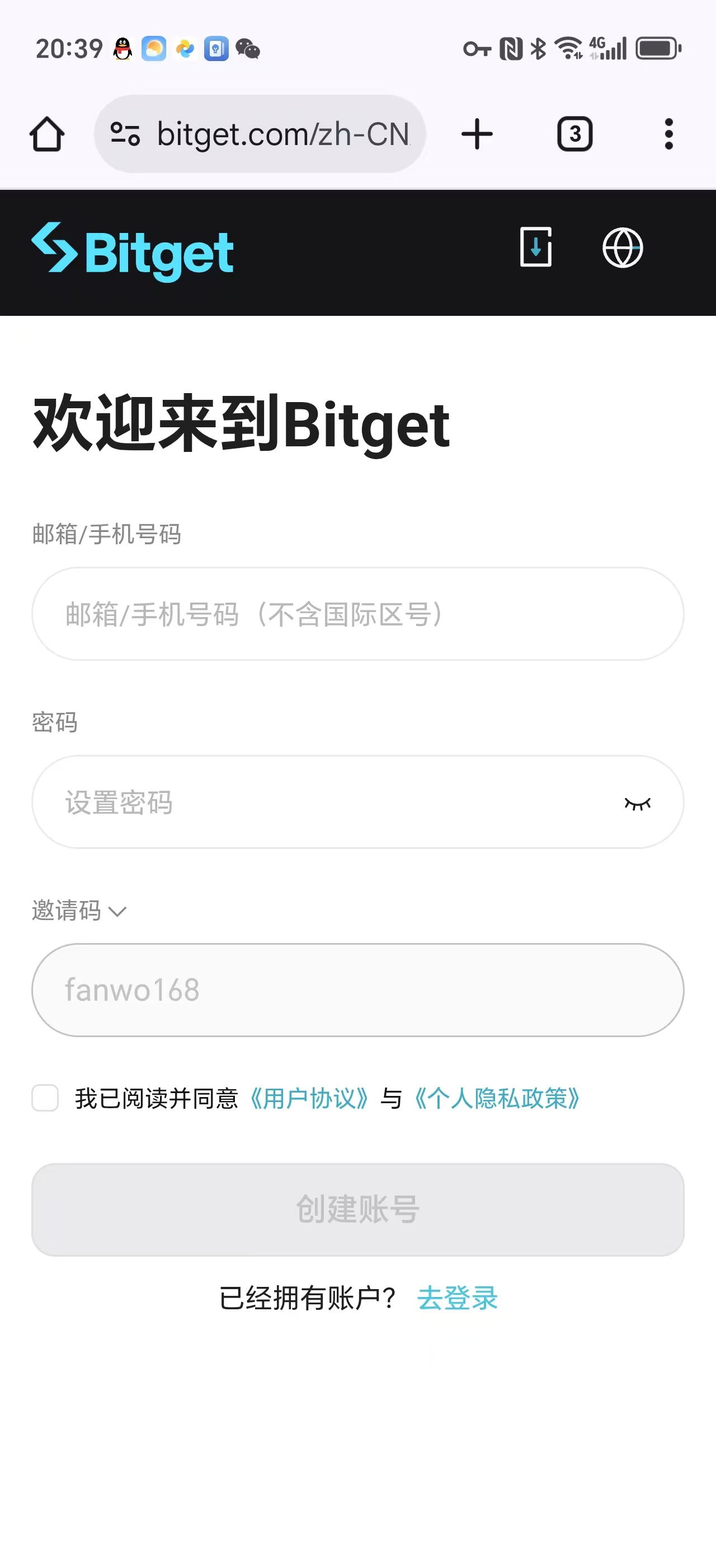 打开注册链接 https://partner.bitget.com/bg/3sd59c2g,进入官方注册页面。