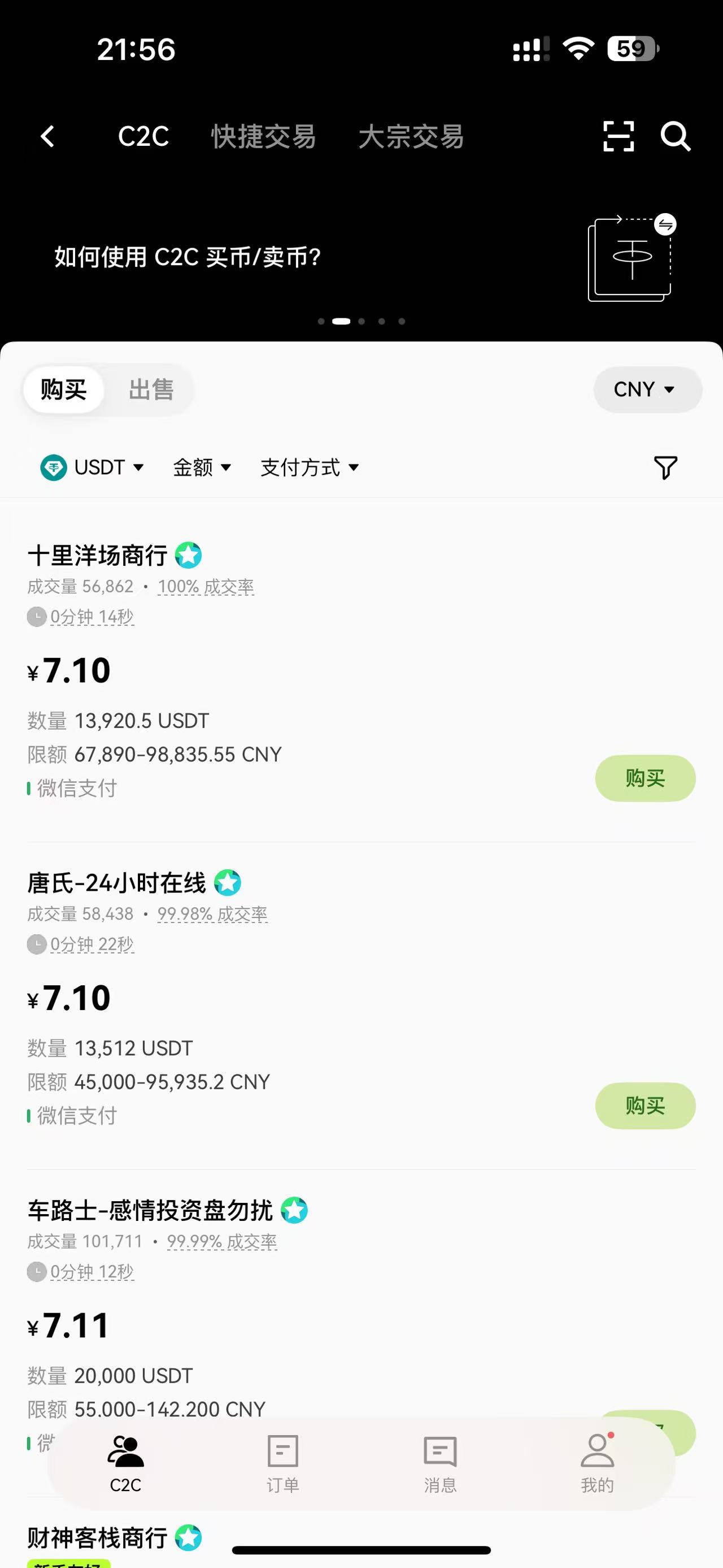 提现:炒完想提钱,只要将你的USDT在C2C市场卖给商家即可,注意:一定要求商家实名付款,不然很有可能会收到黑钱。
