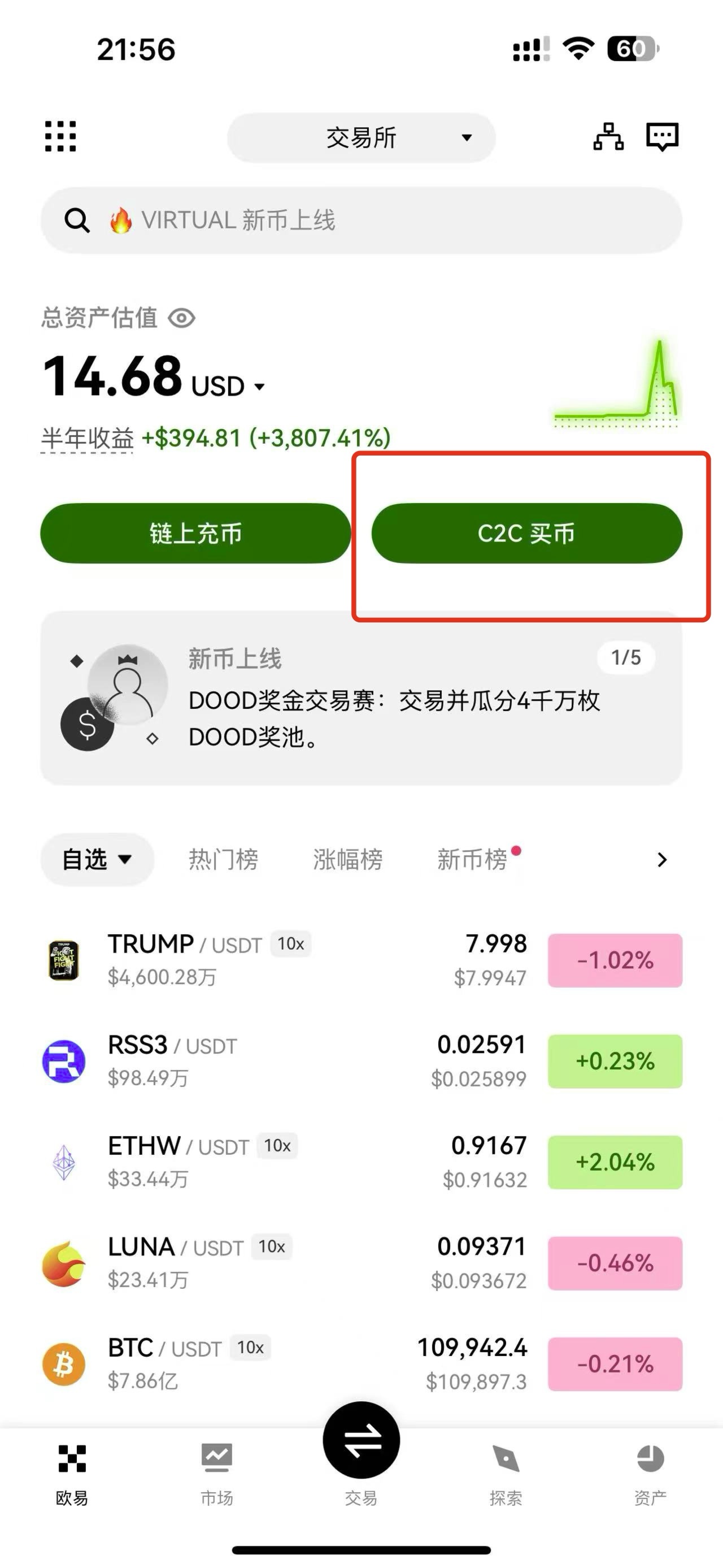 C2C入金:新手一般用C2C买USDT。进App "C2C买币",选靠谱卖家(看评价和完成率),用支付宝/微信/银行卡买USDT,钱直接到你欧易账户。