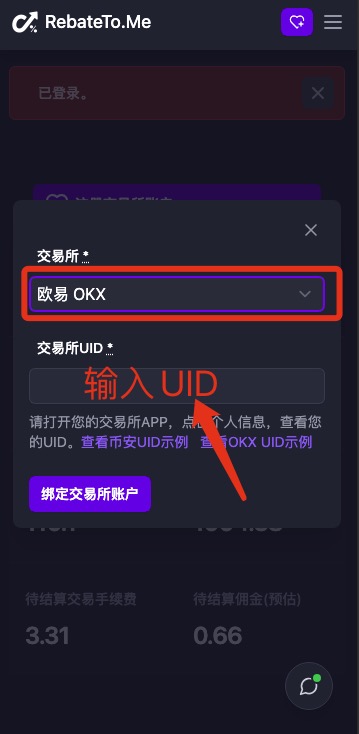 注册成功后点击"绑定交易所账户"——填入你的欧易UID就行了