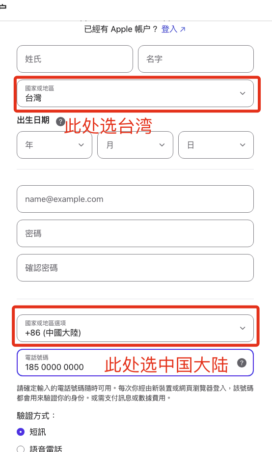 注意:注册新ID时地区务必选择台湾,但是电话号码选择中国大陆手机号
